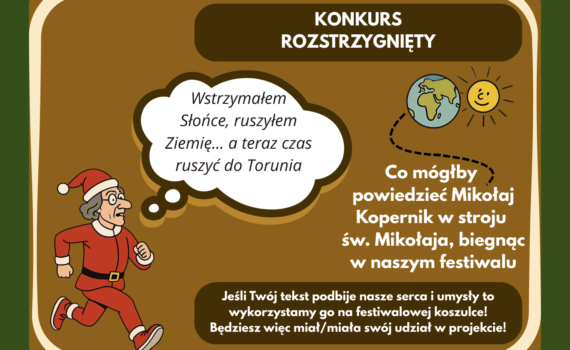 Festiwal Biegów Świętych Mikołajów Zapisz się Nasze Socialmedia No cóż… Kopernik wstrzymał Słońce, ruszył planetę i… razem z Wami rozruszał naszą wyobraźnię! Wasze pomysły… więcej