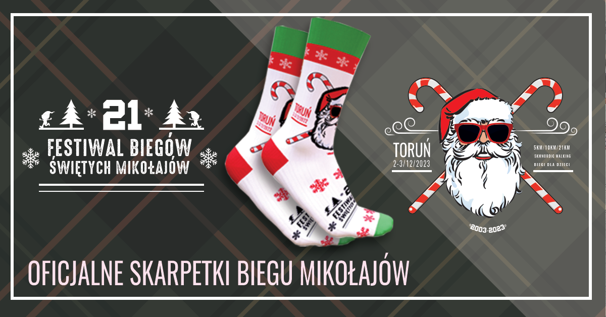 Oprócz tradycyjnej czapeczki i koszulki technicznej z długim rękawkiem św. Mikołaja będą, także czekały na Was skarpetki sportowe z logiem biegu, które przedstawiamy poniżej.