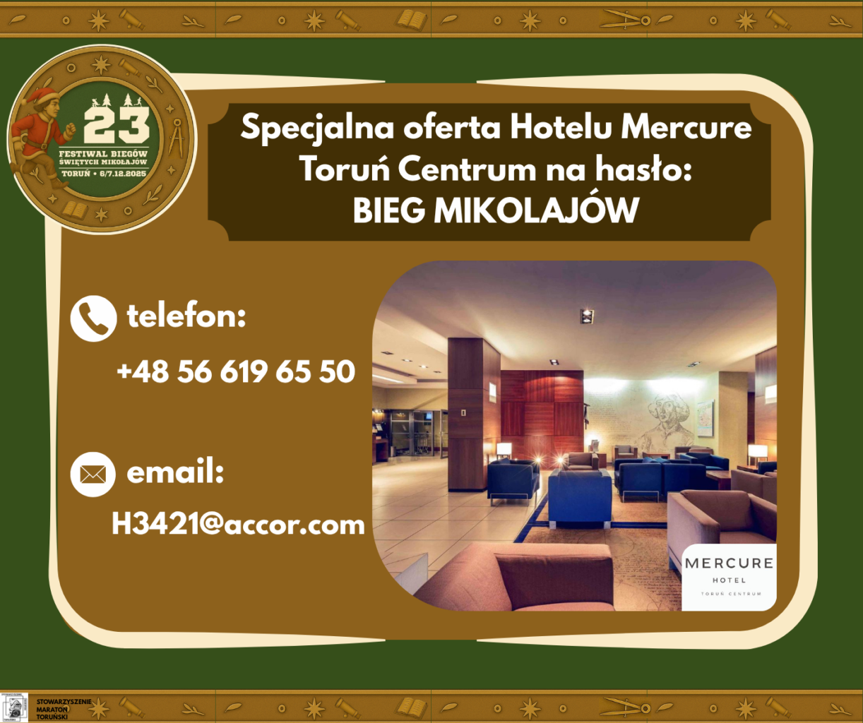 Hotel Mercure Toruń Centrum zaprasza wszystkich biegaczy i kibiców na wyjątkowy, mikołajkowy weekend pełen sportowych emocji i świątecznej atmosfery! 🏃♀️🎄