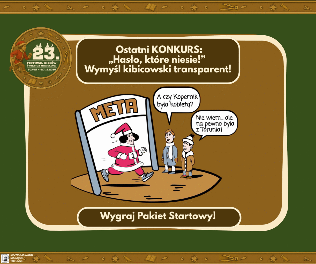 Wszyscy wiemy, że dobry kibic potrafi dodać więcej mocy niż energetyk, a jedno trafione hasło niesione nad głową potrafi „ponieść” nawet najbardziej zmęczonego Mikołaja na trasie! 🏃♂️✨